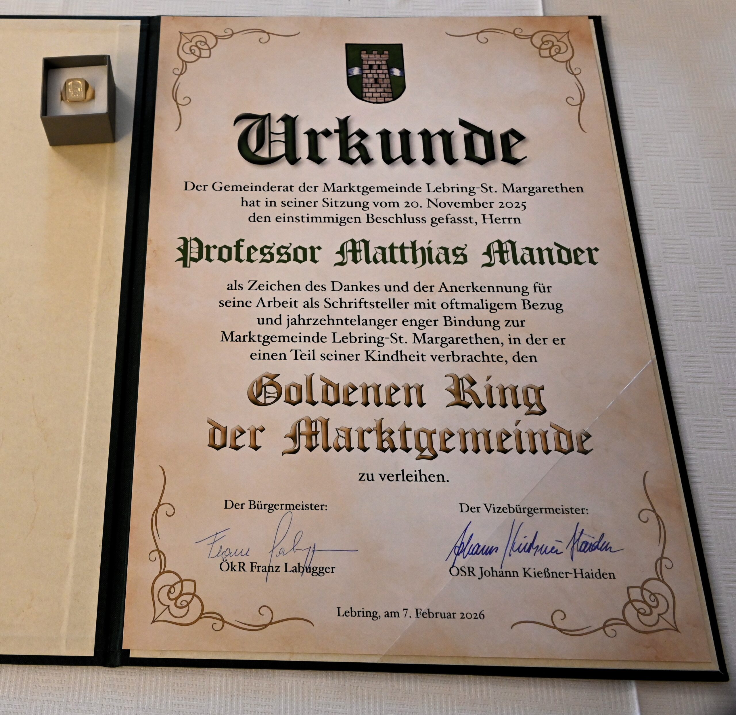 In würdevollem Rahmen und Beisein zahlreicher Ehrengäste wurde am Samstag, 7.Februar 2026 in Lebring-St.Margarethen Herrn Prof. Matthias Mander von Bgm. ÖkR Franz Labugger und Vizebgm. OSR Johann Kießner-Haiden die Auszeichnung „Goldener Ring der Marktgemeinde“ für sein großes literarisches Wirken und seine Verdienste für Lebring, überreicht. Der Vorsitzende des Österreichischen Schriftsteller:innenverbandes, Herr Mag. Christian Teissl, sprach als Laudator eindrucksvoll passende Worte zum Thema „Wo fühlt man seine Heimat? Wo ist man daheim?“