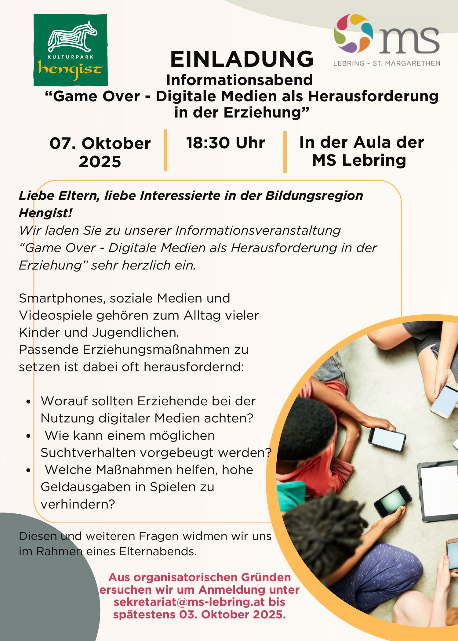 Aus organisatorischen Gründen ersuchen wir um Anmeldung unter sekretariat@ms-lebring.at bis spätestens 03. Oktober 2025.