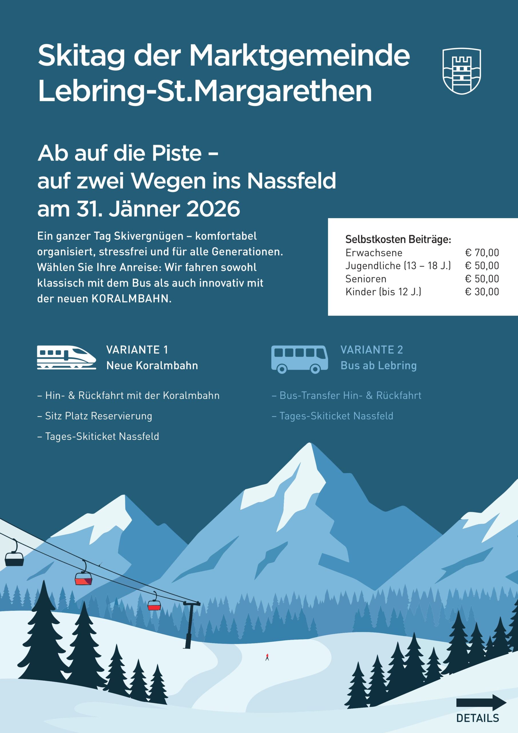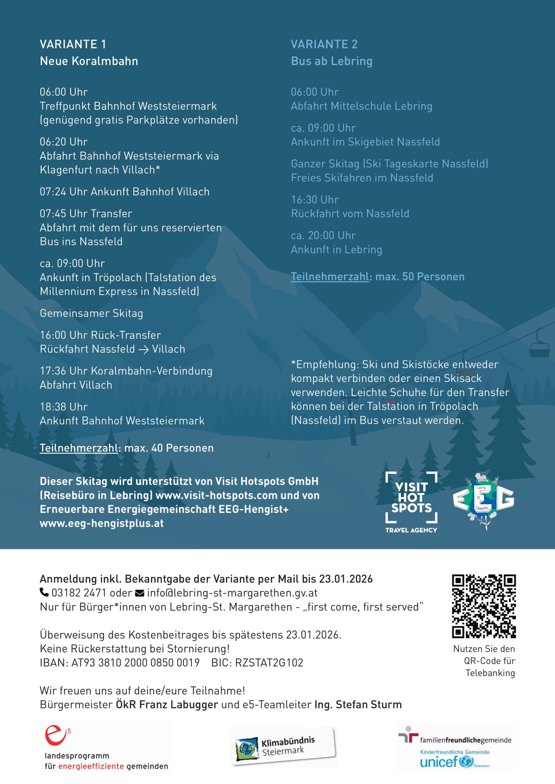 Anmeldunginkl. Bekanntgabe der Variante per Mail bis 23.01.2026 03182 2471 oder info@lebring-st-margarethen.gv.at